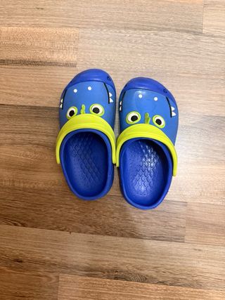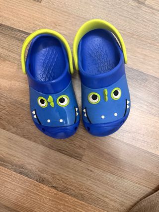 Chanclas infantiles con diseño de dinosaurio en color azul y detalles en verde lima. - Talla 25/26 (sirve para 28). - Diseño divertido con ojos y dientes de dinosaurio. - Tira trasera para mayor sujeción.