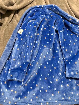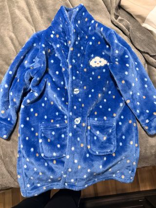 Bata de niño suave y cómoda, ideal para estar por casa. Presenta un divertido estampado de puntos blancos y naranjas sobre fondo azul, con un simpático detalle de nube bordada. - Estampado de puntos. - Detalle de nube bordada. - Dos bolsillos delanteros. - Cierre con botones.