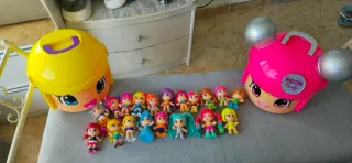 Conjunto de muñecas Pin y Pon. - Incluye dos maletines/casas de muñecas. - Maletín amarillo con forma de cabeza. - Maletín rosa con forma de cabeza y detalles de Neon Party. - Múltiples muñecas pequeñas de diferentes estilos y colores.