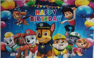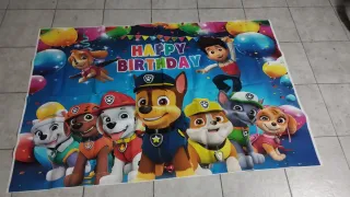 Fondo de tela para fiestas de cumpleaños con temática de la Patrulla Canina. Ideal para decorar el espacio de la celebración. Tamaño: Es amplio (pongo foto con referencia de mi mano y un objeto para hacerse una idea) creo recordar que era minimo de 150x100cm Diseño con muchos personajes de la Patrulla Canina. Impresión: de alta calidad, con colores vivos muy bonitos y buen grosor no es el típico de plástico. Material resistente. Resto de fotos más material de misma temática (preguntar precio)