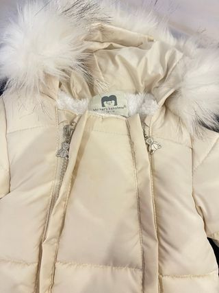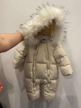 Mono de nieve para bebé, ideal para mantenerlo abrigado en climas fríos. - Color beige. - Capucha con pelo sintético. - Cierre de cremallera frontal. Nuevo un solo uso
