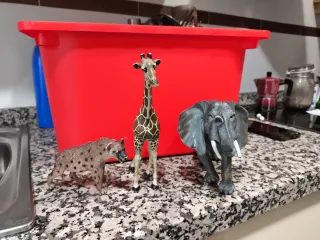 Conjunto de tres figuras de animales de juguete, perfectas para coleccionar o jugar. - Figura de elefante detallada. - Figura de jirafa con manchas. - Figura de hiena con diseño realista. Tipo Schleich