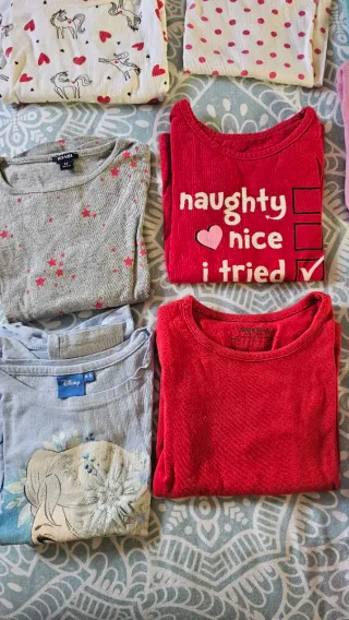 Conjunto de 11 prendas de ropa para niña en talla 4 años. Variedad de estilos y colores. - Camisetas de manga larga. - Diseños con estampados. - Tonos variados como rosa, rojo, gris y azul. Marcas como Zara, Kiabi y el corte ingles