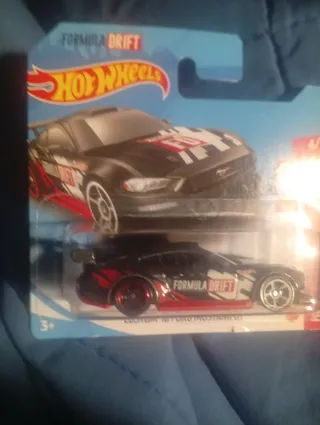 Coche de juguete Hot Wheels de la colección Formula Drift. - Modelo: Custom 18 Ford Mustang GT. - Diseño: Negro con detalles en rojo y blanco. - Escala: 1:64.