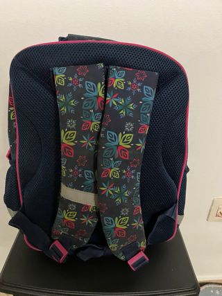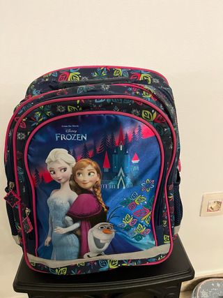 Mochila escolar con diseño de Frozen. - Personajes de la película Disney Frozen. - Estampado colorido con castillo y detalles florales. - Ribetes en color fucsia.