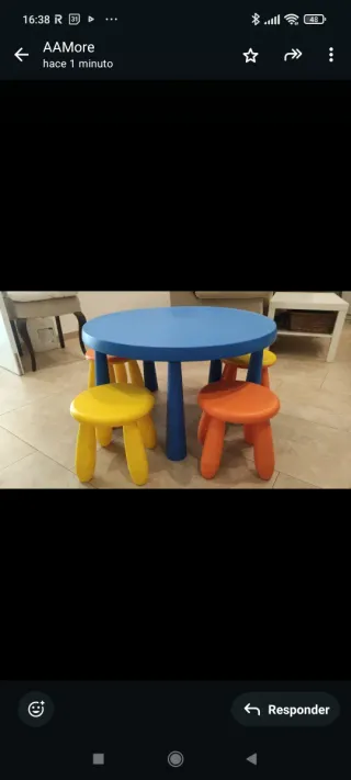 Set de mesa redonda azul con cuatro sillas infantiles de colores (dos amarillas y dos naranjas). Ideal para que los más pequeños jueguen y coman. - Mesa redonda de plástico azul. - Cuatro sillas de plástico de colores vivos.