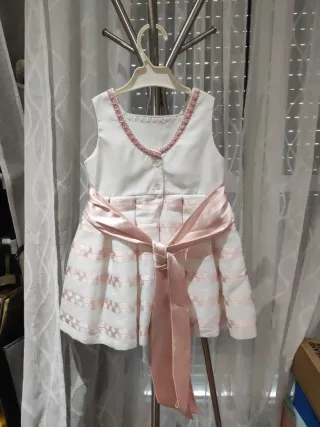Vestido marfil y rosa para ceremonia, talla 4 años. - Escote cuadrado con detalle de pedrería. - Cuerpo con pliegues. - Cinturón de satén rosa. - Falda con vuelo y detalles de cintas rosas.