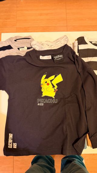 Conjunto de camisetas de manga larga para niño. - Camiseta negra con estampado de Pikachu. - Camiseta gris con rayas azules. - Camiseta azul claro. - Camiseta gris jaspeado. - Camiseta naranja. - Camiseta de rayas negras y blancas.