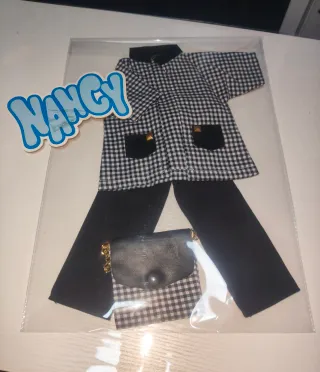 Conjunto de ropa para Nancy que incluye un bolso. - Chaqueta de cuadros blancos y negros con bolsillos. - Pantalones negros. - Bolso negro con cadena dorada y detalle de cuadros.