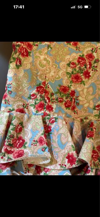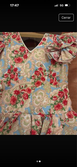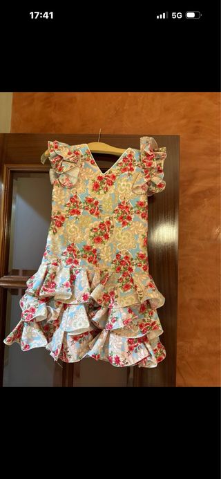 Vestido de flamenca para niña, talla 4 años. Con un bonito estampado floral. - Mangas con volantes. - Cuerpo con escote en V. - Falda con varios volantes.
