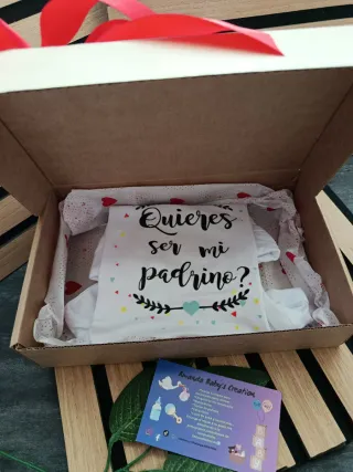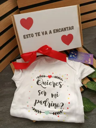 Body blanco para regalar una sorpresa especial a un padrino. El diseño dice ¿Quieres ser mi padrino? con corazones y confeti. - Diseño ¿Quieres ser mi padrino? - Incluye caja de regalo con el mensaje Esto te va a encantar. - Detalle de corazones y confeti de colores.