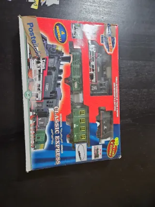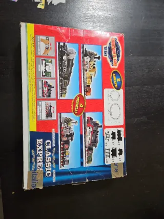 Tren de juguete clásico Classic Express con 4 modelos. - Incluye luces y sonidos. - Funciona con baterías. - Réplica fiel de un tren de vapor. - Caja original. - La caja está un poco machacada pero en buen estado como de 6/10. - El tres funciones perfectamente hace luz y sonido con un sistema de enganche doble que prácticamente nunca se suelta. - Las vías tienen todas sus enganches y no hay ninguna ruta. - Lo envío con pilas nuevas