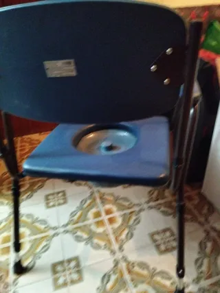 Silla diseñada para personas mayores, con asiento adaptable. - Estructura de metal. - Asiento con orificio. - Patas ajustables en altura.
