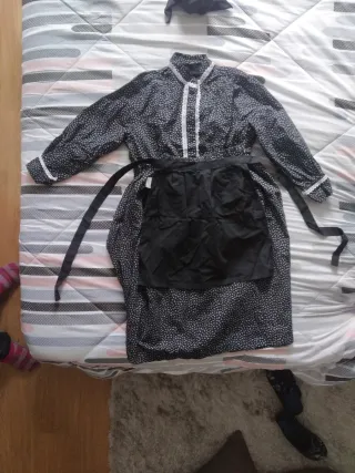 Conjunto de traje de casera con delantal. - Vestido estampado de manga larga. - Cuello alto con detalles blancos. - Delantal negro. - Lazos para atar el delantal.