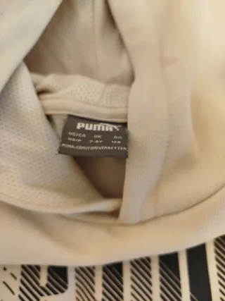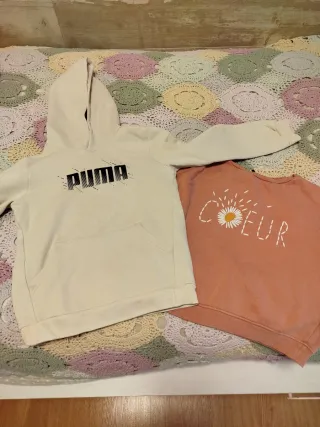 Conjunto de dos sudaderas para niña en talla 8 años. Una es beige con logo Puma y la otra es coral con estampado. - Sudadera beige con capucha y bolsillo delantero. - Sudadera coral con estampado de flor y texto COEUR.