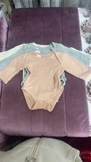 Pack de cuatro bodies de algodón para bebé, talla 0-3 meses. Son suaves y cómodos para el uso diario. - Algodón 100%. - Manga larga. - Cierre a presión en la entrepierna.