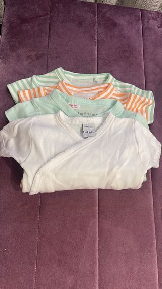 Pack de cuatro bodies para bebé, combinando las marcas Babidu y Lefties. Talla 3 meses. - Body blanco cruzado de Babidu. - Body verde menta de Lefties. - Body naranja y blanco a rayas de Lefties. - Body verde menta y blanco a rayas de Lefties.