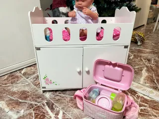 Conjunto de cuna para muñecas con accesorios. - Cuna de madera blanca. - Muñeco incluido. - Accesorios de juego.
