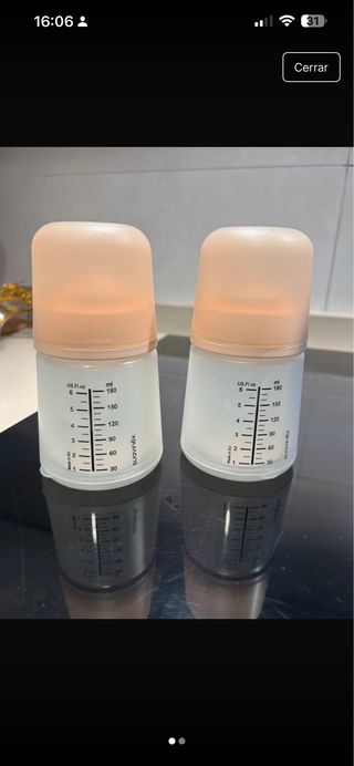 Dos biberones Suavinex de 180 ml con tapón protector. - Capacidad: 180 ml. - Material: Plástico libre de BPA. - Escala de medición en ml y oz.