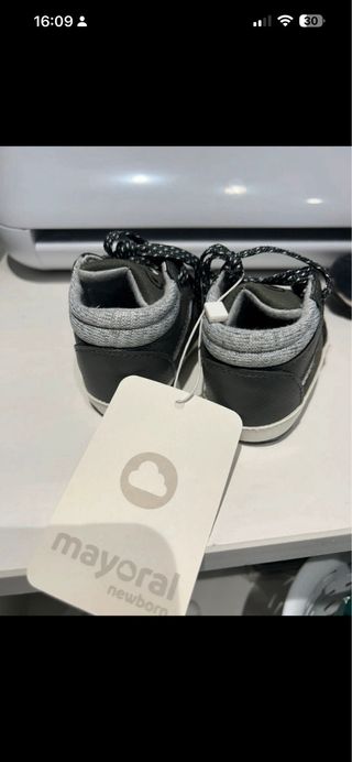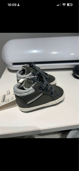 Zapatillas de bebé de la marca Mayoral. Son de caña alta y cierre de cordones. - Color verde militar. - Detalle de costuras. - Suela blanca. Talla 17