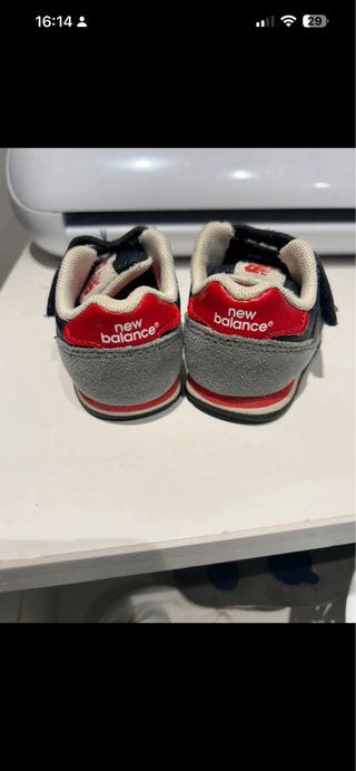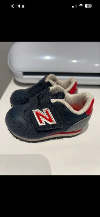 Zapatillas deportivas para bebé de la marca New Balance. - Color azul marino con detalles en rojo y gris. - Cierre de velcro para un ajuste fácil. - Diseño clásico con el logo 'N' en el lateral. Talla 18.5