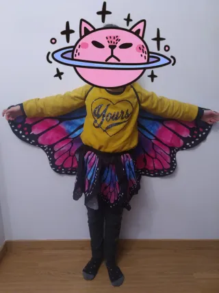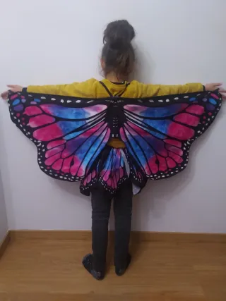 Conjunto de disfraz infantil con alas y falda de mariposa. - Diseño vibrante en tonos fucsia, azul y morado. - Alas con estampado de mariposa y detalles blancos. - Falda con cintura elástica y diseño a juego. - Talla adecuada entre 5-8 años aproximadamente. - Ligero y suave. - Suaves elásticos en los hombros para poner y quitar las alas. - Cinta elástica para los dedos para mostrar y mover las alas.