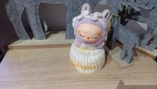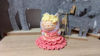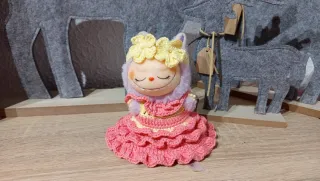 Conjunto de ropa hecho a mano a crochet para la figura Labubu. Incluye un vestido rosa y amarillo con detalles de crochet y un gorro con flores. - Vestido de crochet rosa y amarillo. - Gorro con flores amarillas.