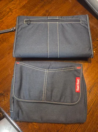 Práctico cambiador portátil de la marca Tuc Tuc, ideal para llevar lo esencial. - Diseño en tela vaquera. - Cierre de cremallera. - Bolsillos frontales.
