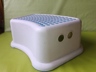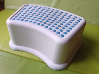 Alzador infantil de la marca Ikea, modelo Försiktig. Ideal para ayudar a los más pequeños a alcanzar superficies más altas. - Superficie superior con puntos antideslizantes en color azul. - Diseño blanco con base curva. - Dos orificios laterales para facilitar el transporte.