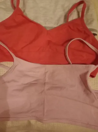 Lote de cuatro sujetadores deportivos para niña, talla 10. - Diseño tipo camiseta. - Tiras finas. - Acabado suave al tacto. Precio por los cuatro