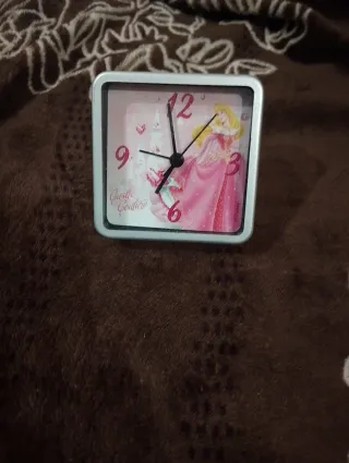 Reloj de mesita con diseño de princesa Disney. - Ilustración de princesa con castillo y mariposas. - Números y manecillas en contraste.