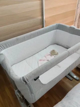 Minicuna en color gris y blanco, en perfectas condiciones. Sistema de anclaje sencillo para juntarla a la cama (colecho). Altura regulable, además, se puede inclinar para evitar cólicos y favorecer la respiración en caso de congestión nasal. Ventanilla de aireación y lateral abatible. Posee dos ruedas pero también se puede utilizar en modo balancin. Colchón transpirable. Incluye dos protectores de colchón, sabanas bajeras, colcha y mosquitera.