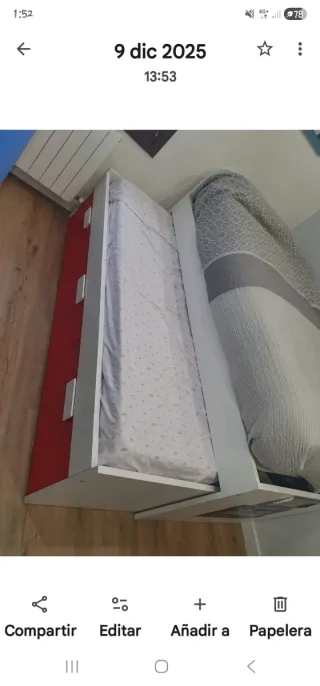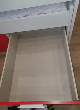 Cama nido con un diseño moderno y funcional, ideal para optimizar el espacio. - Estructura blanca. - Cajones frontales de color rojo.