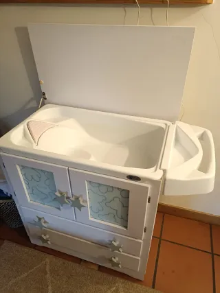 Cambiador con bañera incorporada para bebés, en buen estado. - Diseño funcional y seguro. - Estructura blanca con detalles infantiles. - Incluye cajones y puertas para almacenamiento.