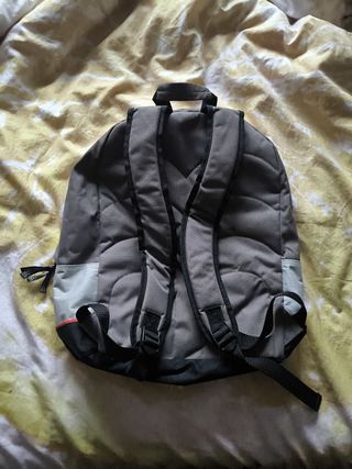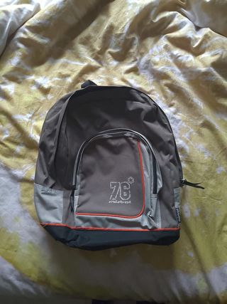 Mochila tipo escolar de la marca Mistral con un diseño moderno y práctico. - Color gris y detalles en naranja. - Compartimento principal espacioso. - Bolsillo frontal con cremallera. - Logo '76 Mistral' estampado.