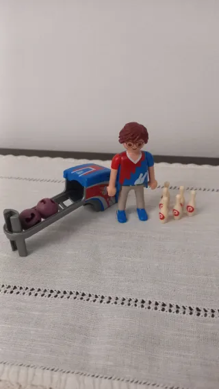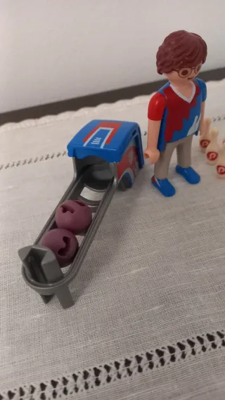 Set de Playmobil de bolos con todo lo necesario para jugar. - soporte para bolos con diseño de rayas rojas y azules. - 2 bolas de bolos moradas. - 6 bolos blancos con detalles rojos.