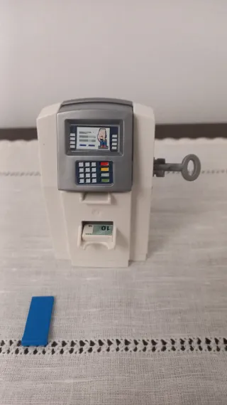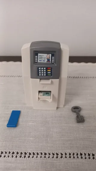 Cajero automático de Playmobil con detalles realistas. - Incluye 6 billetes y llave. - Panel con teclado y pantalla.