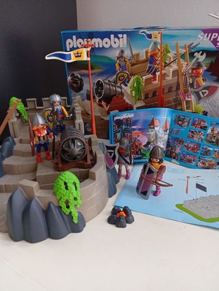 Set de Playmobil de caballeros medievales con temática del lobo, castillo y una fortaleza. - Incluye varios caballeros con armaduras y cascos. - Figuras con espadas, escudos y una bandera. - Elementos de la fortaleza con escaleras y murallas. - Caballos con armadura para montar. Incluyo algunos accesorios más (cascos, armas, escudo...) y un caballo más. He añadido el castillo sin subir el precio.