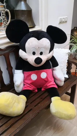 Peluche de Mickey Mouse de gran tamaño, perfecto para coleccionistas o como regalo. Mide aprox. 1'65m de alto. ESTÁ SUCIO. Necesita una buena limpieza pero no tiene roturas ni roces - Diseño clásico de Mickey Mouse. - Colores: negro, rojo, amarillo y blanco. - Material suave y agradable al tacto.