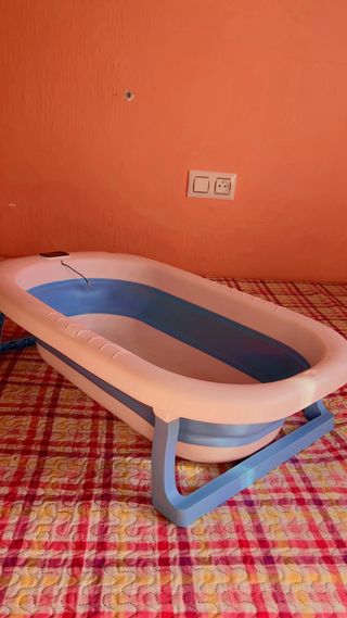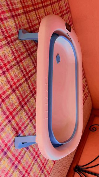 Bañera plegable para bebés, diseñada para hacer el baño más seguro y cómodo. Incluye un termómetro integrado para controlar la temperatura del agua. - Diseño plegable para fácil almacenamiento. - Color blanco y azul. - Termómetro para medir la temperatura del agua.