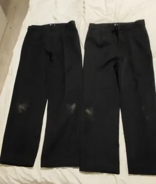 Pantalones de uniforme escolar en color gris, talla 6-7 años. - Cintura elástica y ajustable con botones. - Cierre de botón y cremallera. - Dos bolsillos laterales. - también usados para fundación Victoria. Tienen las rodillas rozadas, por lo que habría que ponerle rodilleras
