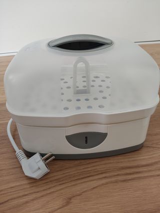 Está como nuevo, apenas se ha usado 4 veces. Sirve para esterilizar hasta biberones de 33cl. Se puede usar para esterilizar 🍼 y chupetes o solo tetinas y cosas de menor tamaño en la cubileta más pequeña, con menos cantidad de agua