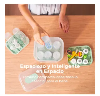 Esterilizador para biberones de la marca AVENT. Diseñado para facilitar la higiene de los utensilios del bebé. - Color verde agua. - Diseño con rejillas para colocar los biberones y accesorios.