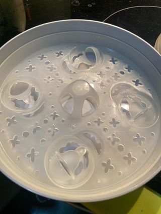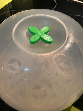 Esterilizador de biberones con tapa transparente. - Base blanca. - Tapa de plástico translúcido. - para usarlo en microondas. - se ha usado solo 2 veces. - capacidad para 4 biberones y 4 tetinas.