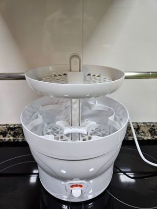 Esterilizador de utensilios de bebé, también para 6 biberones a la vez. Calienta biberón al vapor, alimentos al vapor (verduras), y huevos al vapor. Usado pero bien conservado y cuidado. Por 5€ más, se añade exprimidor de zumos. Ver fotos
