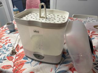 Esterilizador eléctrico de la marca Chicco con función de secado. - Diseño moderno y funcional. - Fácil de usar. Tambien incluyo un almacenador de biberones y chupetes. La placa esta en perfecto estado solo esta sucia se limpia bien con un antical y queda como nueva. Puede esterilizar hasta 7 biberones. Y la plancha de arriba para tetinas y chupetes.