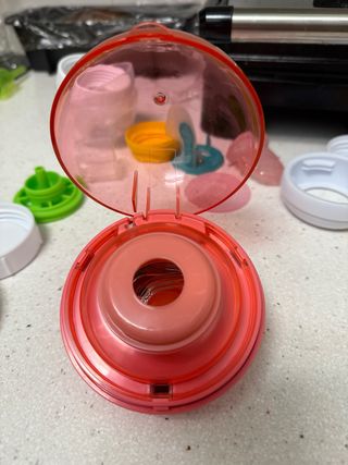 Esterilizador de chupetes portátil de la marca Suavinex,no tengo la caja pero está sin usar . Su diseño es compacto y ovalado, con una tapa transparente y base rosa. - Color rosa y transparente. - Marca Suavinex.