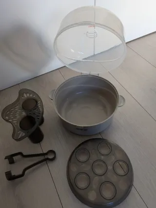 Esterilizador para Microondas. Con capacidad para 6 biberones y sus componentes y tetinas, los esterilizarás sin ningún producto químico. Muy fácil de usar. Se hecha agua y al micro. A mí me ha resultado muy cómodo para esterilizar.