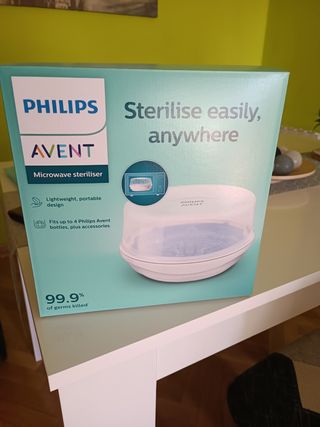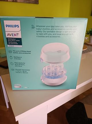 Se vende esterilizador a vapor para microondas de marca Philips Avent, capacidad de 4 biberones, se esterilizando en 2 minutos. Se vende sin usar, ya que ha sido un regalo y teníamos otro