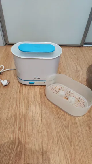 Esterilizador de biberones para microondas de la marca Philips Avent y calientabiberones también de Philips Avent, ambos en perfecto estado (usados sólo en segunda residencia) El calientabiberones sirve también para calentar los potitos, muy práctico para llevarlo de viaje y no ocupa mucho espacio.